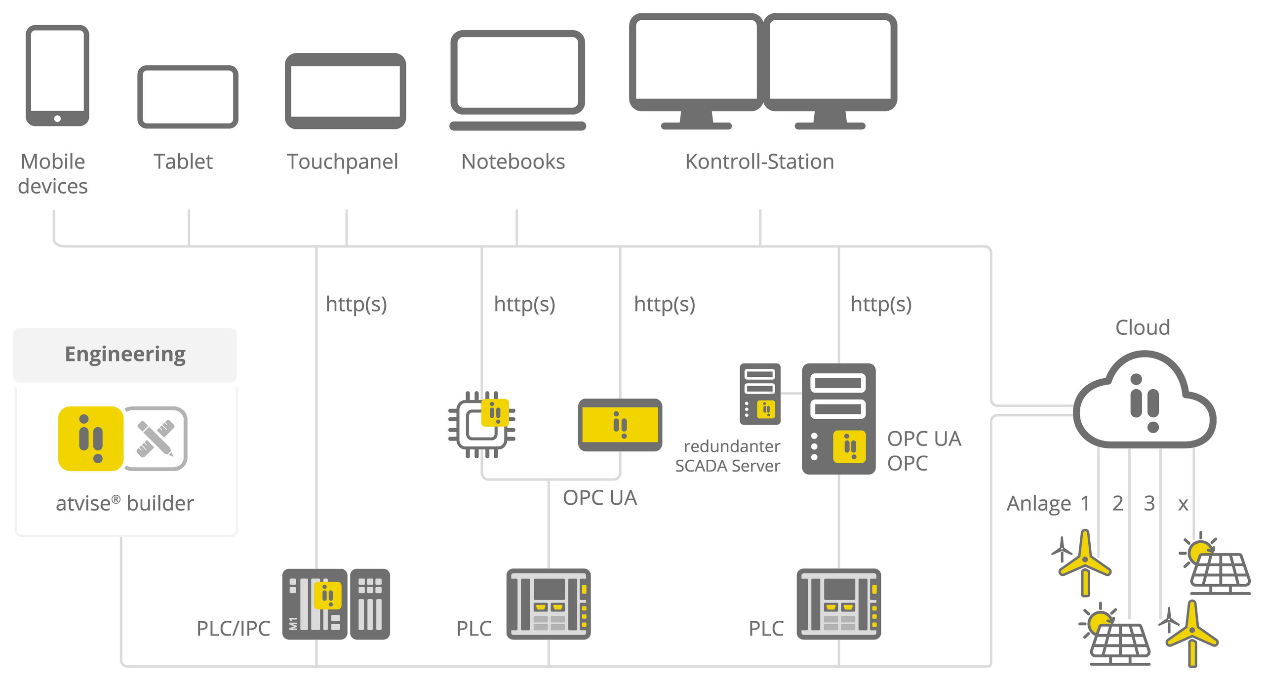 Der Aufbau von atvise erlaubt die Skalierung sehr kleiner Anwendungen mit wenigen Dutzend Informationspunkten bis zu hin Großanlagentechnik mit mehreren 100.000 Prozessgrößen. Die Visualisierung steht auf allen Geräten mit handelsüblichem Browser zur Verfügung.